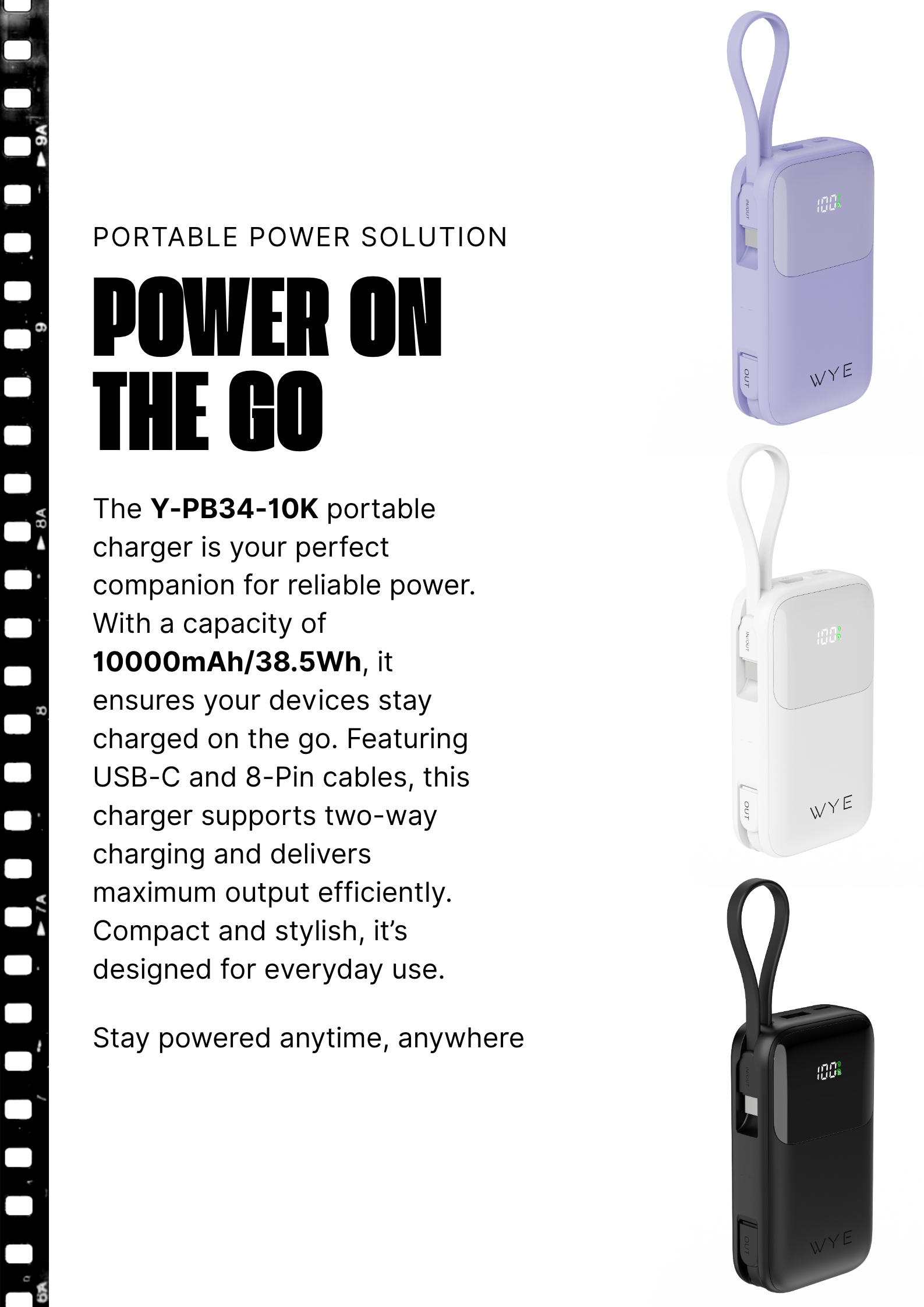 Model: Y-PB34-10KCapacity:10000mAh/38.5WhInput:-USB-C Port: 5V= 3A, 9V=2A-USB-C Cable: 5V=3A, 9V=2AOutput:-USB-C Cable: 5V=3A, 9V=2.22A, 10V=2.25A, 12V=1.67A (22.5W Max)-8-Pin Cable: 5V=2.4A, 9V=2.22A (20W... Read more