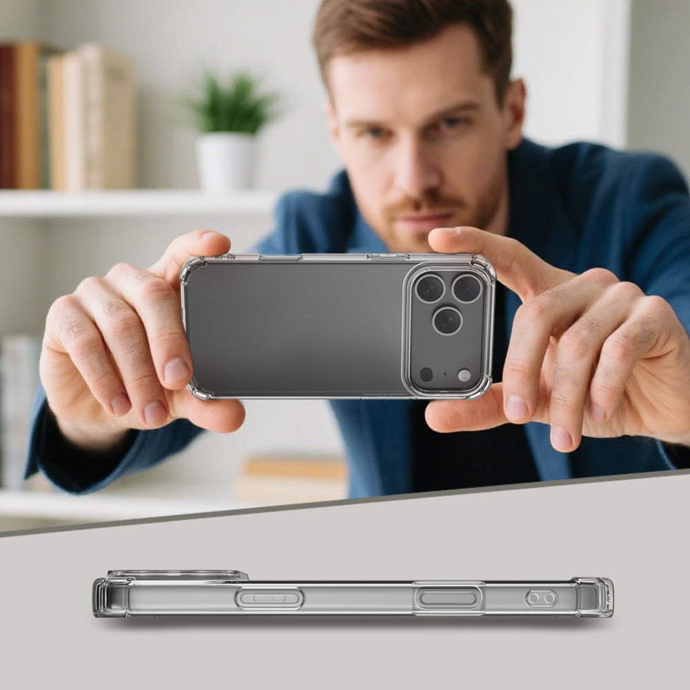 Protect your iPhone 17 Pro fully with the Clear Anti-Shock Armor Case Kit—rugged defense meets sleek transparency.
